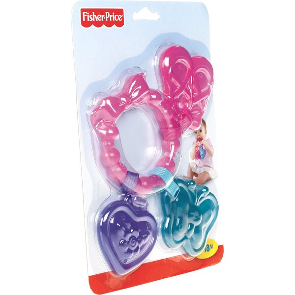 Duży gryzaczek w kształcie bransoletki z trzema gryzaczkami w kształcie motylka, serduszka i baletek, w pięknej intensywnej kolorystyce. Zabawkę można zawiesić nad łóżeczkiem, wózkiem lub fotelikiem.