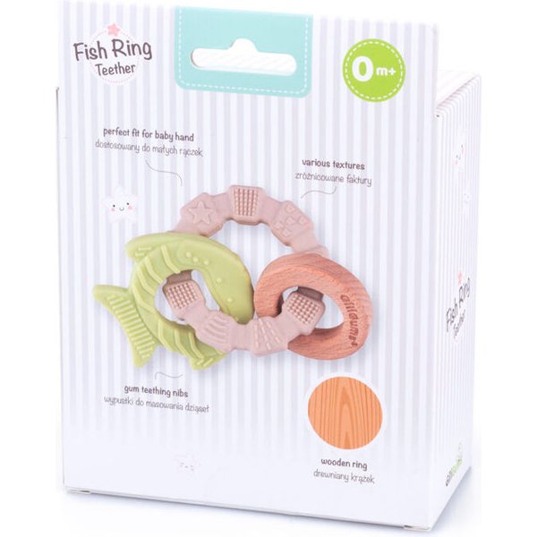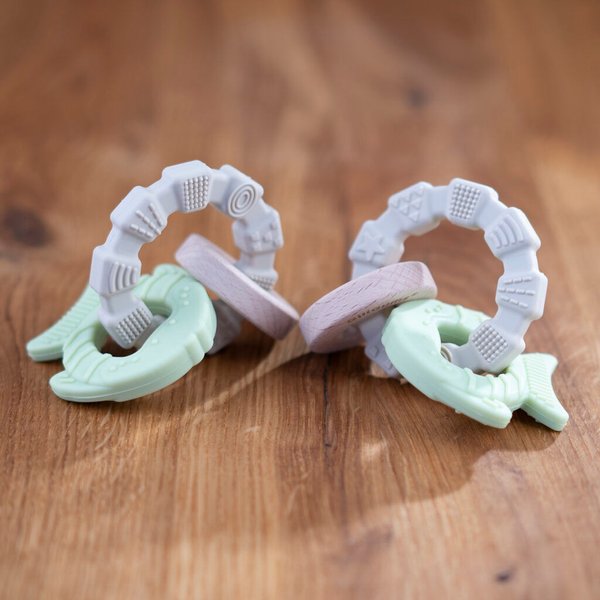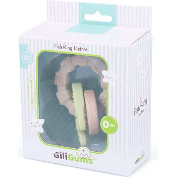 Drewniana kolekcja od Giligums to niezwykłe produkty, które wykonane zostały z drewna bukowego. Dzięki czemu posiadają oryginalny design, który zachwyci każdego. Dodatek bezpiecznego silikonu sprawia, że jest on bezpieczny podczas użytkowania przez maluszki. Cały gryzak składa się z pierścienia, który posiada nieregularne kształty oraz różnorodne wypustki. Do tego dołączone zostały dwie zawieszki: kółeczko i rybka. Taki zestaw pozwoli delikatnie wymasować obolałe dziąsełka i załagodzić ból podczas ząbkowania.