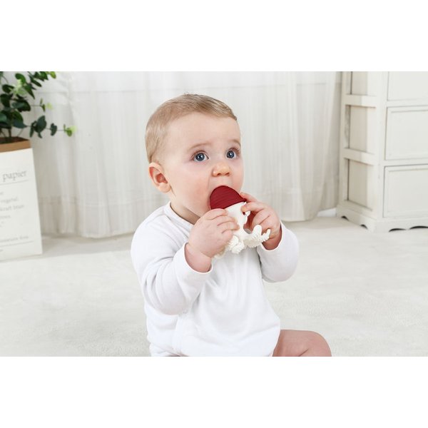 Gryzaczek Ośmiorniczka ma przyjazny kształt i sprawdzi się także jako zabawka! Jego rozmiar został dopasowany do małych rączek naszej pociechy, by ułatwić samodzielne trzymanie.