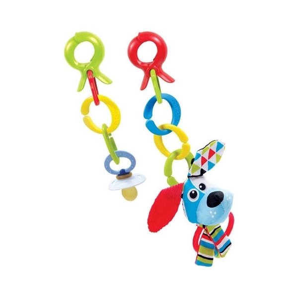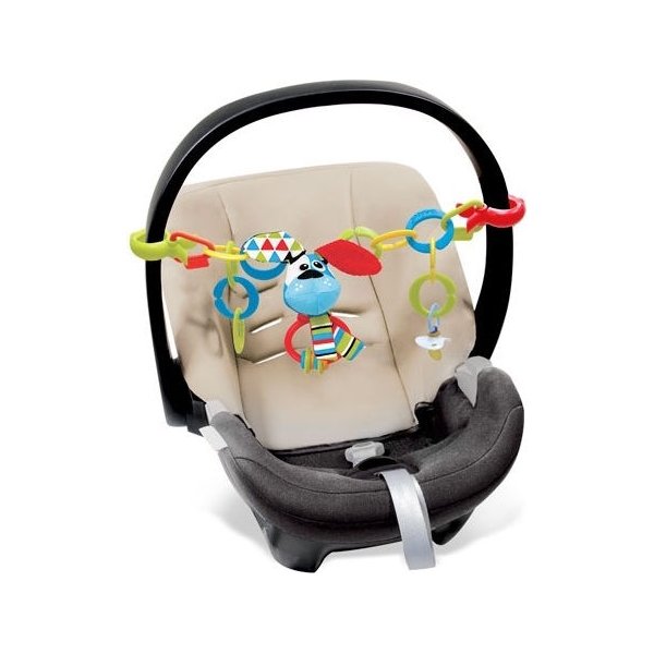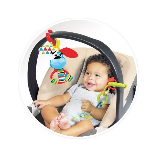 Grzechotka jest pełna atrakcji i różnorodnych faktur, które stymulują zmysły dziecka. Mały piesek posiada koloroweobręcze, które kolejno można ze sobą łączyć tworząc długi łańcuch. Dodatkowo dwa uniwersalne klipsy pozwolą na zawieszenie zabawki np. w foteliku.