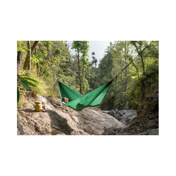 Model wykonany jest z bardzo wytrzymałego nylonowego materiału spadochronowego, co jest gwarancją trwałości, a także niewielkiej wagi. Materiał jest elastyczny, więc dobrze dopasowuje się do ciała, a do tego jest oddychający i szybkoschnący. Dzięki temu hamak jest odporny na pleśń i doskonale się sprawdzi w trudnych warunkach, np. w tropikach. Hamak Ticket To The Moon szybko się składa i rozkłada. Do tego ma specjalny pokrowiec, więc jest wygodny w transporcie. Będzie stanowić doskonałą alternatywę dla karimat, a nawet namiotów.