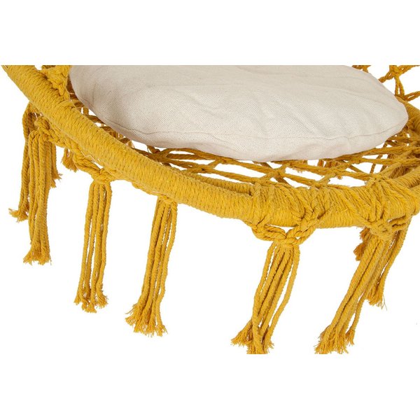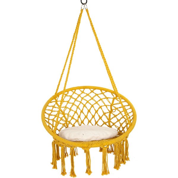 Obręcz jest stalowa i solidna, a maksymalne obciążenie wynosi 120 kg, więc możesz czuć się bezpiecznie podczas leniuchowania. Dołączona poduszka jest miękka i poprawia komfort wypoczynku. Fotel będzie stanowił ładną ozdobę, sploty dobrze się prezentują a ozdobne frędzle świetnie dopełniają wyglądu. Montaż jest łatwy i intuicyjny - metalowe pierścienie wystarczy zamontować na uchwycie (np. haku, karabińczyku)