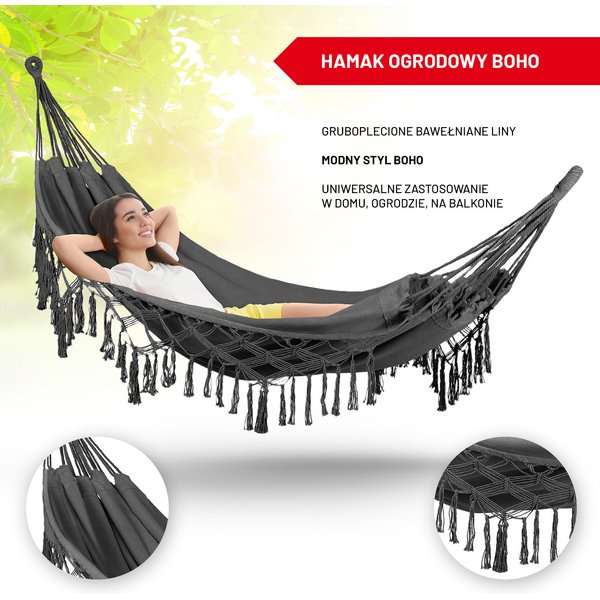 Grubo plecione, bawełniane liny oraz frędzle sprawiają, że hamak wpasuje się w każde wnętrze w stylu Boho. Całość została wykonana z dbałością o detale.