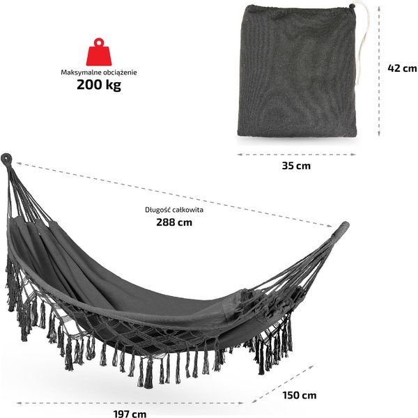 Hamak świetnie się prezentuje, co wynika z dbałości o detale. Dodatkowo wykorzystane materiały sprawiają, że hamak jest wytrzymały. Ten model wytrzymuje udźwig aż do 200 kg.