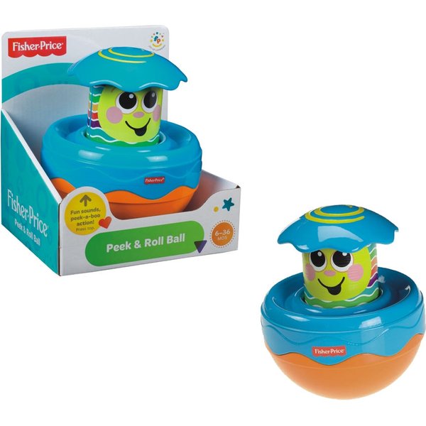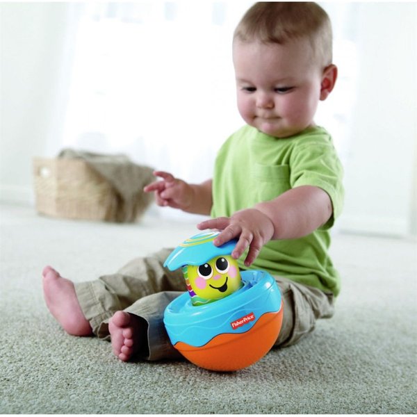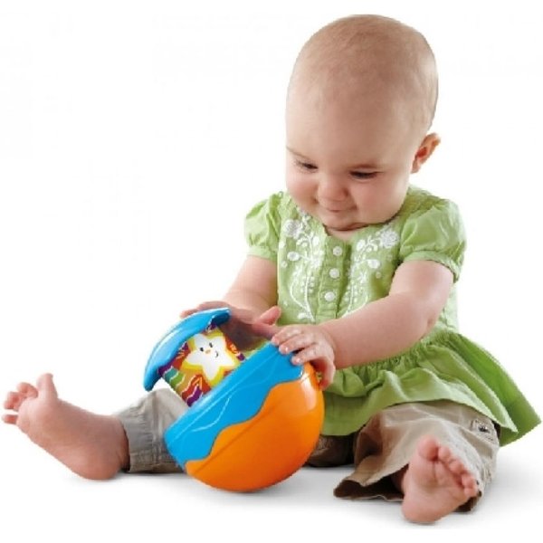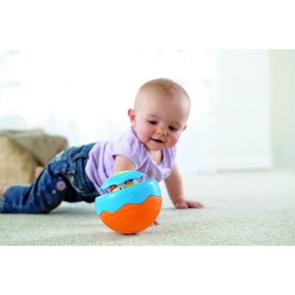 Wiele radości i niespodzianek za każdym razem, gdy bawi się piłeczką "a kuku". Piłeczka jest poręczna, łatwa do chwytania dla małych rączek, wystarczy ją lekko pchnąć aby zaczęła się turlać. Gdy maluszek naciska na pokrywkę, piłeczka piszczy, a gdy dziecko ją poturla, piłeczka zagrzechocze. Jest też niespodzianka - wesoła buzia ukryta w kuli, z którą maluch może się bawić w a kuku.