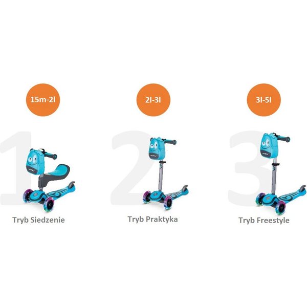 - Etap 1 - dla dzieci już od 15 miesiąca życia - tryb pozycji siedzącej, w której dziecko bezpiecznie może się poruszać
