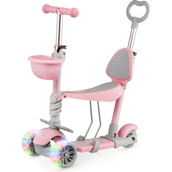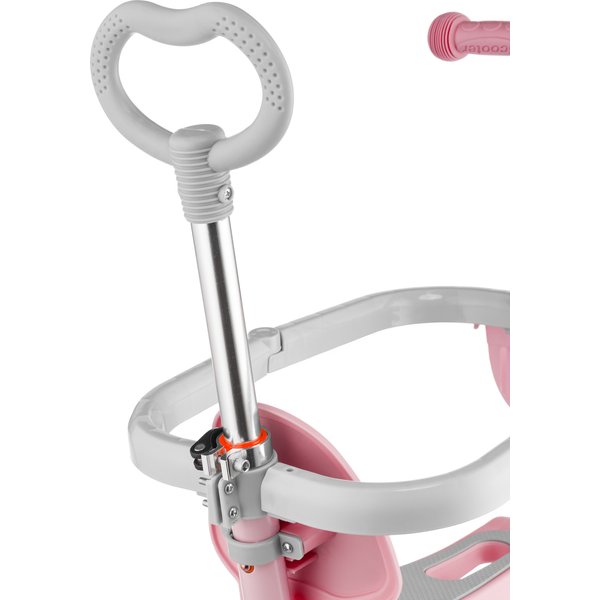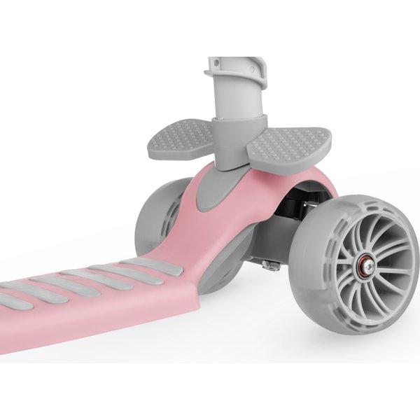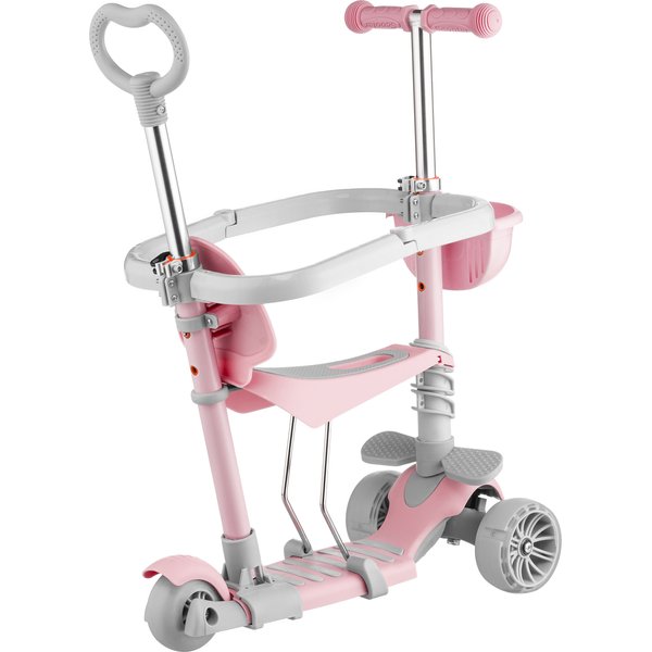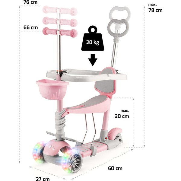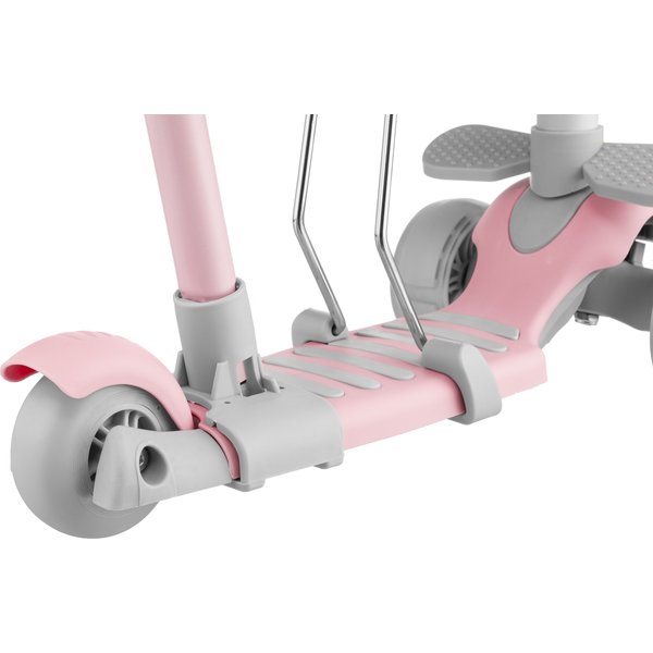 Przemyślana konstrukcja oferuje 5 opcji użytkowania: jako jeździk z siedziskiem i rączką dla rodzica oraz blokadą, jako jeździk z siedziskiem i rączką dla rodzica, jako jeździk z siedziskiem oraz jako balansowa hulajnoga trójkołowa z koszykiem lub bez. Sprawia to, że produkt rośnie wraz z dzieckiem, a o monotonii nie ma mowy. Jeździk z siedziskiem i rączką dla rodzica oraz blokadą to rozwiązanie dla dzieci, które dopiero poznają skating. Wygodne, wyprofilowane siedzisko i boczne podnóżki zapewnią komfort jazdy. Rączka dla rodzica ma regulowaną wysokość, w efekcie czego można wygodnie kontrolować jadące dziecko. Gdy maluch nabierze już wprawy, można korzystać z jeździka bez rączki oraz bocznej osłony.