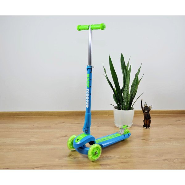 Za sprawą trójkołowej konstrukcji hulajnoga jest stabilna i umożliwia bezpieczną i kontrolowaną naukę jazdy. Magic Scooter sterowany jest balansem ciała, co sprawia, że maluch rozwinie zmysł równowagi, by w przyszłości móc jeździć na klasycznej hulajnodze. Regulowana wysokość kierownicy z antypoślizgowymi rączkami pozwala na użytkowanie hulajnogi przez wiele sezonów, bowiem rośnie ona razem z dzieckiem. Przestronny podest z wypustkami zapewnia przyczepność i komfort jazdy. Tylny błotnik pełni funkcję hamulca. Jeśli przyciągająca uwagę kolorystyka nie zachęci dziecka do jazdy, z pewnością zrobią to świecące przednie kółka, które mienią się wszystkimi kolorami tęczy.