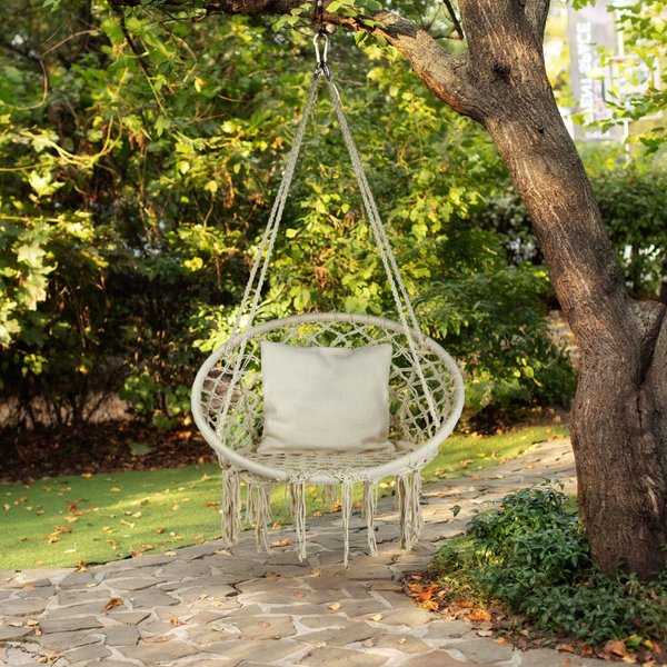 Pleciona konstrukcja zapewnia wysoką oddychalność, a ręczne wykonanie metodą makramy zapewnia wysoką jakość. Sznurki wykonano z trwałej i miękkiej w dotyku, grubej bawełny. Wytrzymała konstrukcja bocianiego gniazda sprawia, że jego maksymalne obciążenie wynosić może aż 150kg. Ozdobne frędzle i estetyczny, uniwersalny kolor sprawiają, że huśtawka stanowi cieszące oko miejsce do relaksu. Możliwość mocowania huśtawki zarówno na złączonych i rozłączonych uchwytach sprawia, że możesz umieścić ją w dowolnym miejscu na zewnątrz lub wewnątrz.