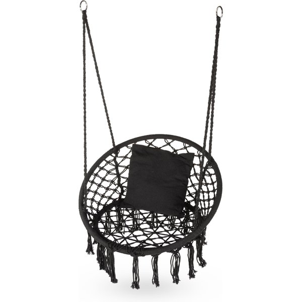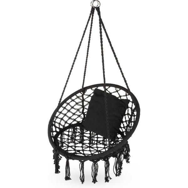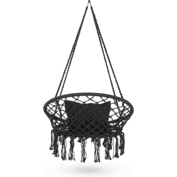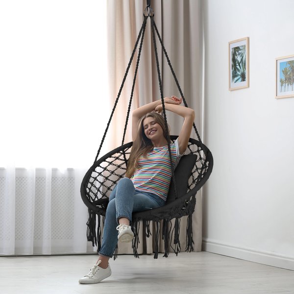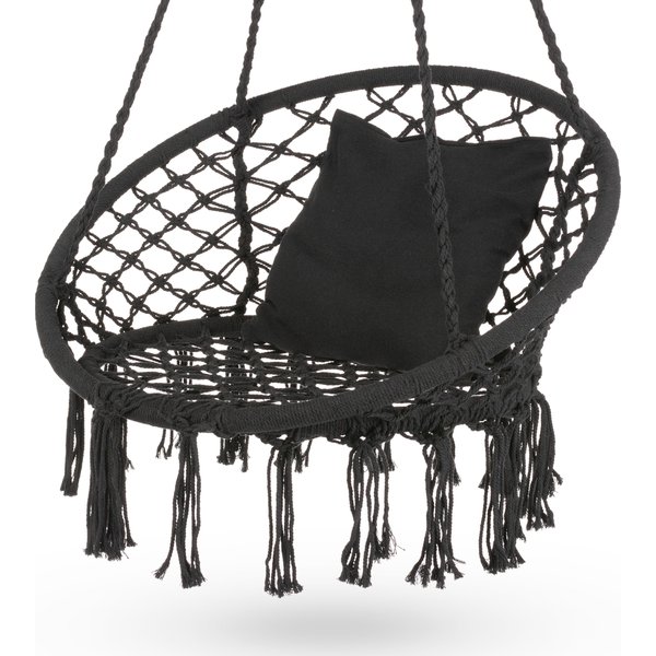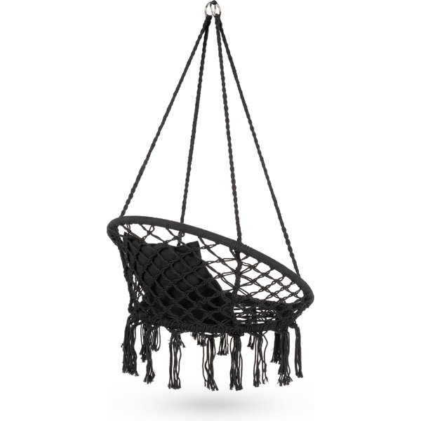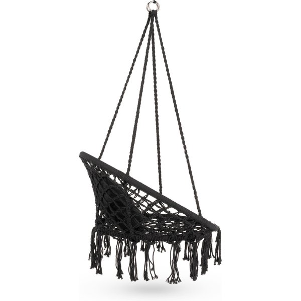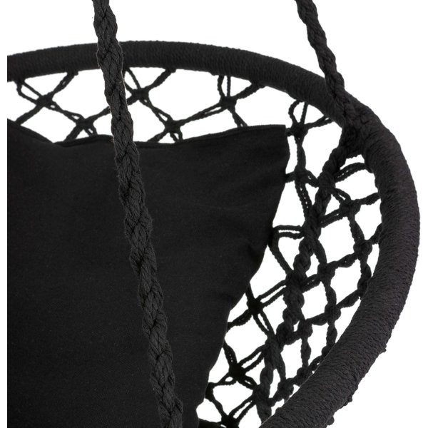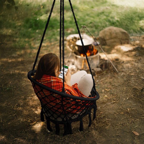 Huśtawka doskonale się prezentuje, gdyż została wykonana metodą makramy. Sznurki są lekkie i niezwykle trwałe, więc oprócz niepowtarzanego stylu boho zyskujesz solidny produkt.