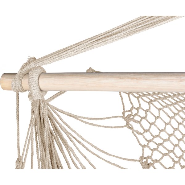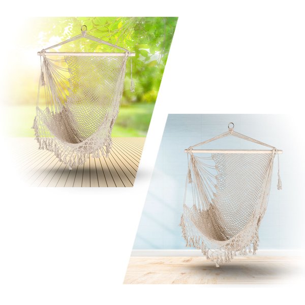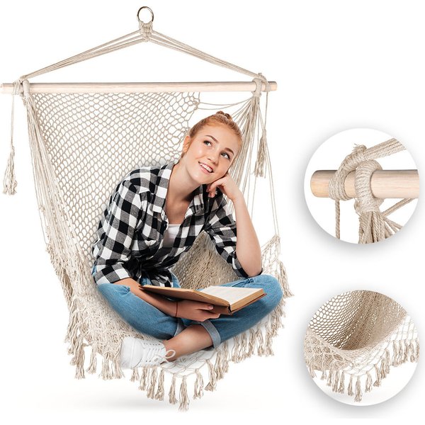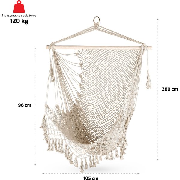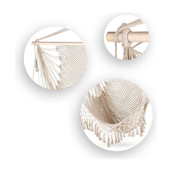 To doskonały wybór dla miłośników natury. Huśtawka została wykonana w modnym stylu boho, który kojarzy się z naturą, harmonią i wypoczynkiem. Materiał, z której wykonano huśtawkę jest trwały, a przy tym miły w dotyku, dlatego wygodnie się na niej siedzi. Wymiary fotelu brazylijskiego umożliwiają komfortowe ułożenie się, dlatego możesz godzinami siedzieć na nim i czytać książkę lub pić ulubioną herbatę. Drewniany pałąk zapewnia odpowiednie utrzymanie huśtawki, a przy tym sprawia, że całość wygląda bardzo naturalnie. Huśtawka ma niewielką wagę, dlatego zawieszenie jej nie będzie problemem. Atutem jest wysoki udźwig, wynoszący aż 120 kg.