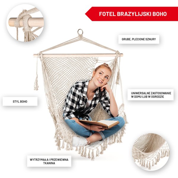 Fotel brazylijski powinien stać się uzupełnieniem każdej przestrzeni. Dlatego ten model został wykonany w stylu Boho. Materiał, frędzle oraz jasna kolorystyka wpasują się w każde wnętrze.