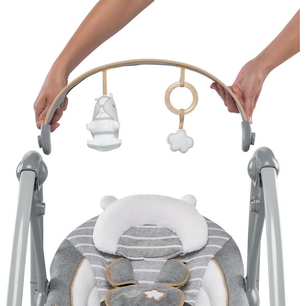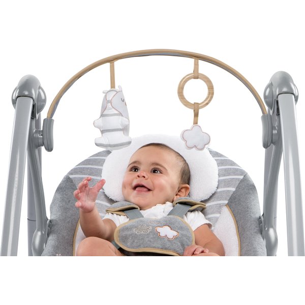 Huśtawka hybrydowa od Bright Starts zachwyca swoim pięknym wyglądem. Pozwoli zaoszczędzić wiele miejsca do czego przyczyni się kompaktowy rozmiar. Dziecko będzie mogło spędzać w niej wiele radosnych chwil. Nie trzeba się przy tym martwić o jego bezpieczeństwo dzięki 5-punktowym pasom, które są pokryte miękkim materiałem co zapobiegnie przed otarciami na skórze dziecka. Siedzisko również zostało wyłożone tkaniną miłą dla skóry dziecka, który sprawi, że relaks i zabawa w huśtawce będzie przyjemnością. Ściągany pałąk z 3 zabawkami umili czas maluchowi, a dodatkowe funkcje (8 melodii, 3 dźwięki natury, biały szum) przyniosą jeszcze więcej rozrywki. Huśtawka posiada również regulację głośności oraz wyłącznik czasowy.