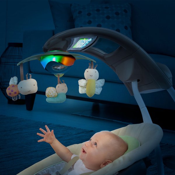 - komfortowy leżaczek do zabawy w ciągu dnia, dzięki wbudowanej karuzelce z miękkimi zabawkami oraz możliwością podłączenia smartfona. Karuzelka zaciekawi maluszka projekcją kolorowych światełek, zaś bajki odtwarzane za pomocą smartfona umilą maluszkowi odpoczynek na długi czas