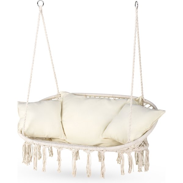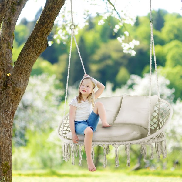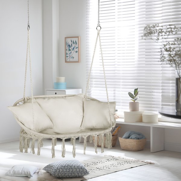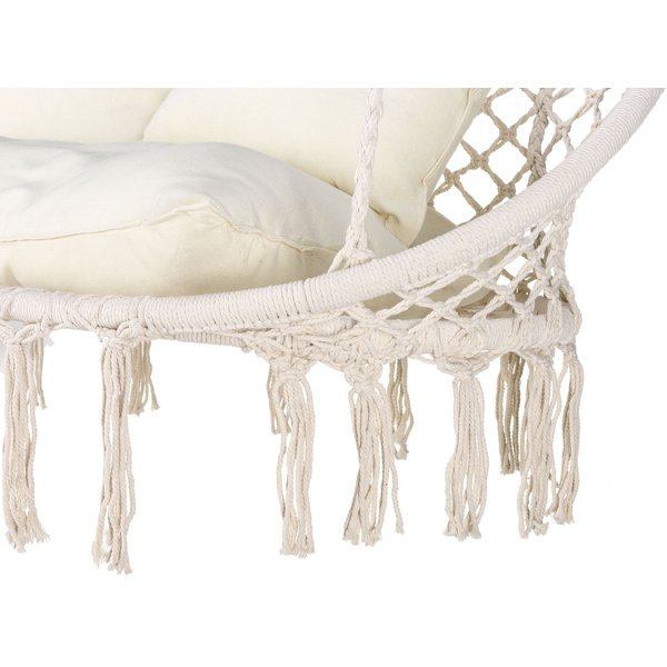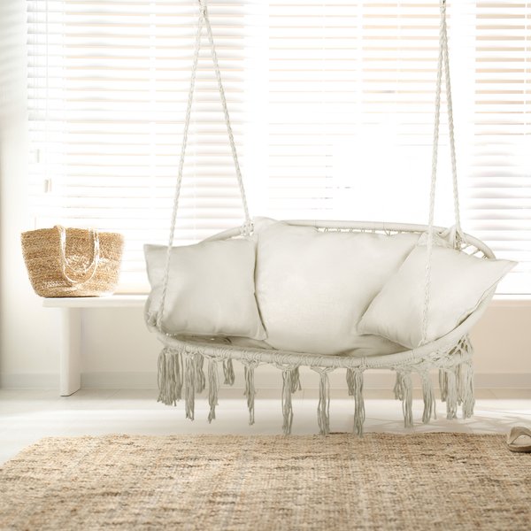 Huśtawka świetnie się prezentuje, co wynika z wysokiej jakości wykonania. Modny styl Boho wpasuje się w domową przestrzeń. Delikatna kolorystyka i frędzle sprawią, że Twoje mieszkanie będzie przytulniejsze.