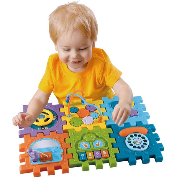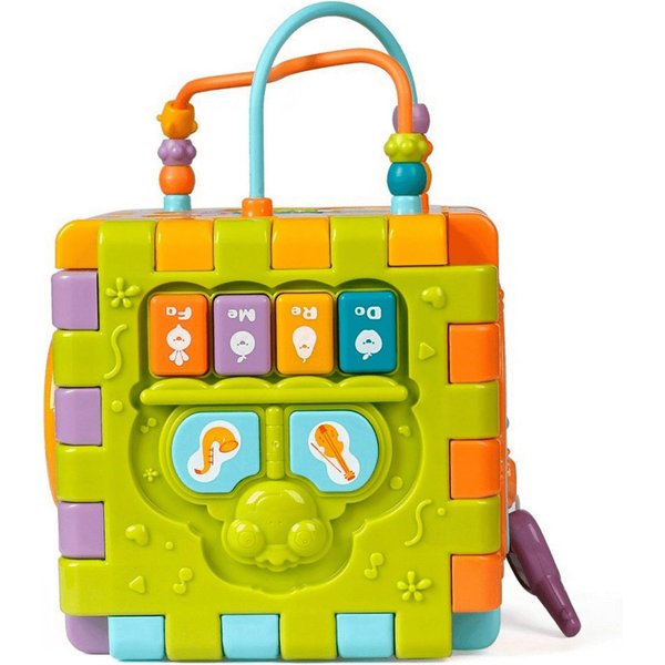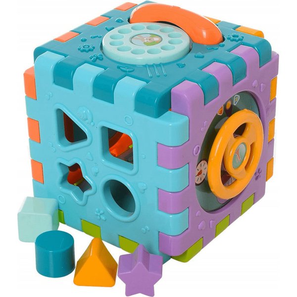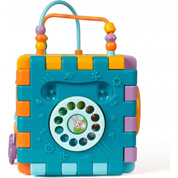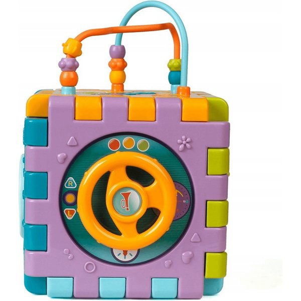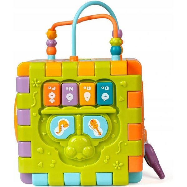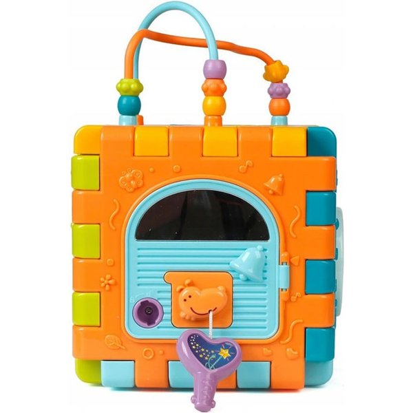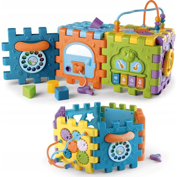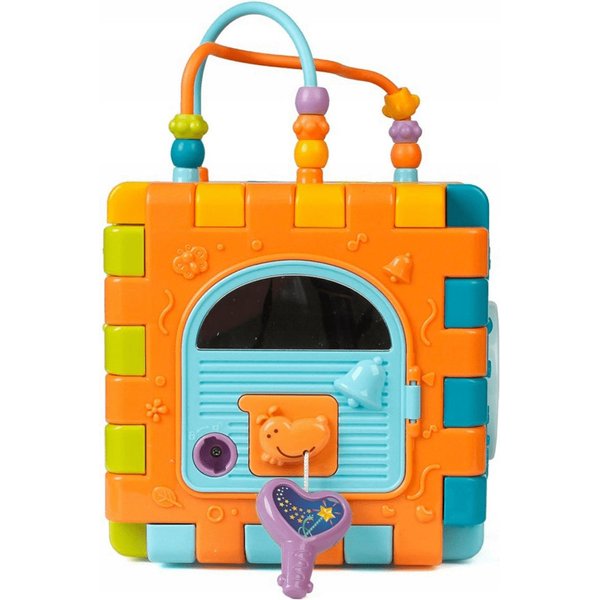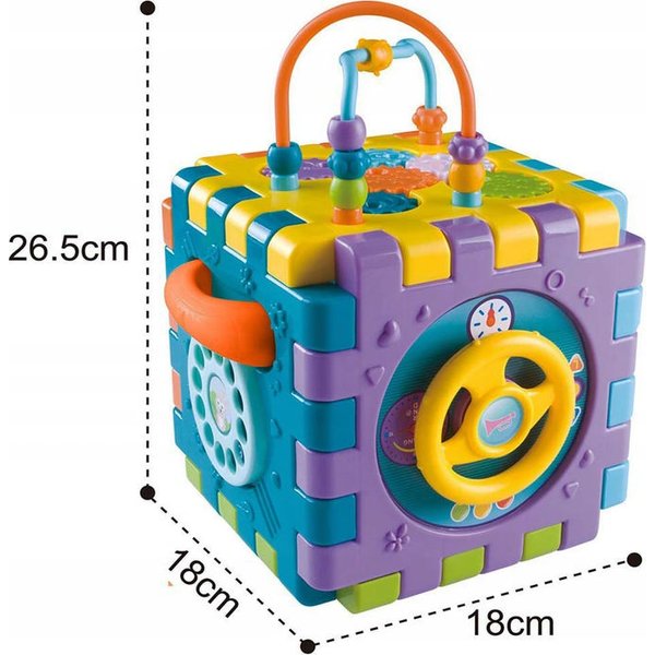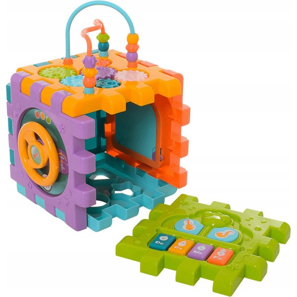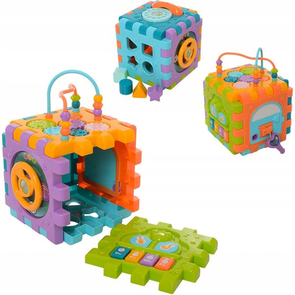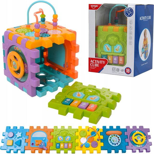 Wielofunkcyjna kostka edukacyjna w formie sześciu puzzli do składania! Każdy z elementów posiada inną aktywność, które pozwolą pobudzić różne zmysły i bodźce do działania. Maluch będzie miał do dyspozycji wiele aktywności, które zajmą go na długie godziny. Przy okazji zabawy będzie mógł rozwijać swoje zdolności manualne i umysłowe. Co takiego kryje w sobie kostka? Pianinko, które po naciśnięciu klawisza będzie wydawał dźwięki i pobudzi zmysł słuchu. Drzwi na kluczyk, które trzeba będzie otworzyć zanim spojrzy się do środka. Tarczka z cyferkami pozwoli wejść w świat liczb. Sorter, który pozwoli przyswoić dziecku kształty i nauczyć się dopasowania ich do odpowiednich otworów. Przeplatanki, które stanowią zarówno uchwyty jak i doskonałe ćwiczenie manualne.