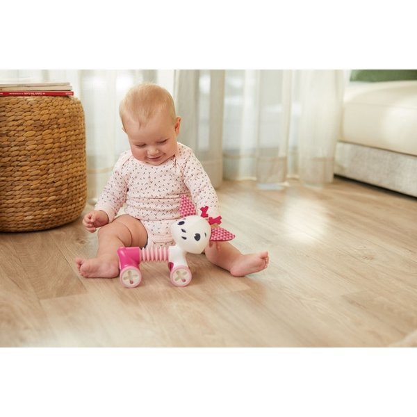 Zwierzątko będzie towarzyszyć dziecku podczas podróży, spaceru czy zabawy w domu. Posłuży mu przez długie lata, zaczynając od zabawy na brzuszku, a kończąc na spacerowaniu z nim. Gdy rozciągniemy jej tułów, zmienimy sposób poruszania się. To pozwoli dziecku zrozumieć zależność przyczynowo-skutkową. Jej unikalna budowa pozwoli na wiele sposobów zabawy. Przewracanie, rozciąganie, skręcanie, co tylko dusza zapragnie! Oprócz tego zabawka ma za zadanie stymulować zmysły. Posiada szeleszczące elementy, wirującą kulkę z koralikami oraz dźwięk kliknięcia.