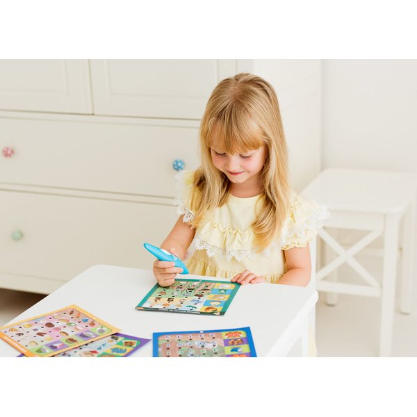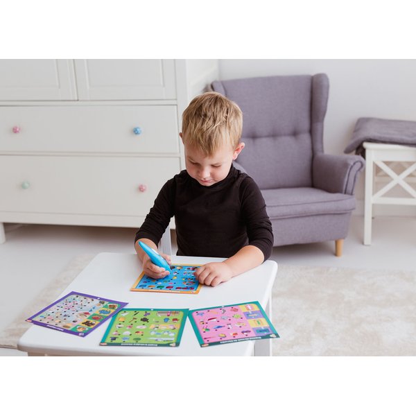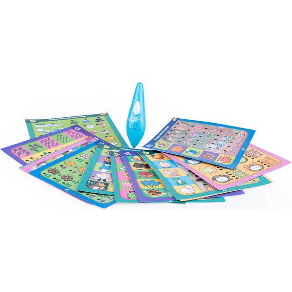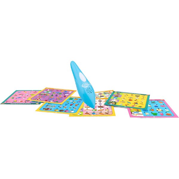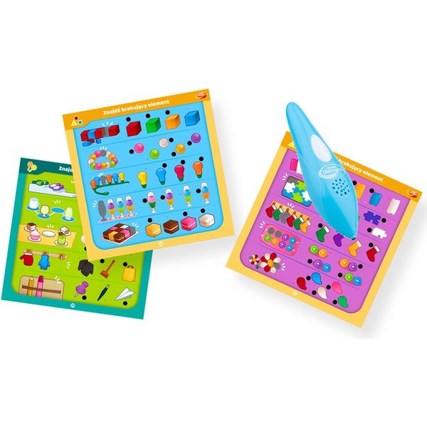 W opakowaniu znajdują się dwustronne karty z pytaniami w różnych kategoriach tematycznych. Zadaniem malucha jest wskazanie za pomocą długopisu poprawnej odpowiedzi. O tym, czy dziecko odgadło poprawną odpowiedź, poinformuje wskaźnik LED i komunikat głosowy długopisu.