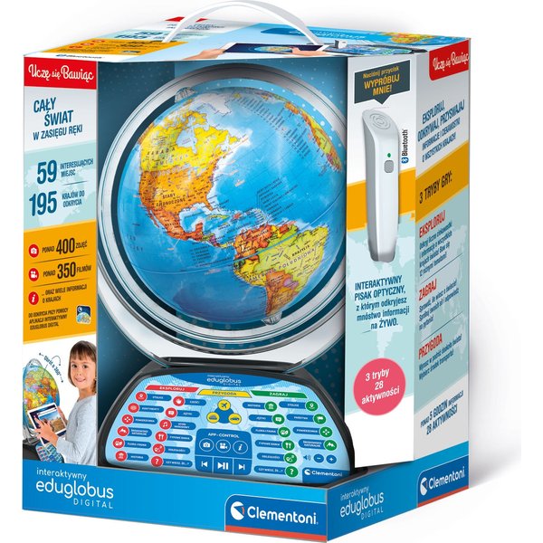 Jego zdecydowaną zaletą jest fakt, że obraca się on o 360 stopni, co pozwoli dokładnie zwiedzić każdy zakamarek na mapie. Do zestawu dołączone jest specjalne pióro, które po podłączeniu do komputera umożliwi nam pobranie jeszcze większej ilości informacji, co pozwoli rozszerzyć nasza wiedzę. Zachwyć wszystkich znajomością świata! Globus posiada również try przygody, która pozwala na wybranie środka transportu (statek, samochód czy samochód) jaki będziemy się poruszać i zwiedzać.