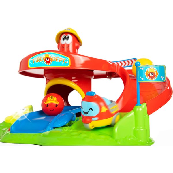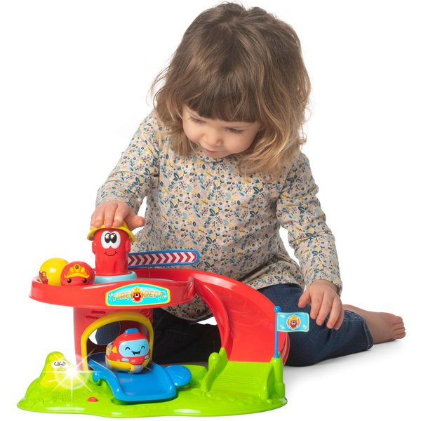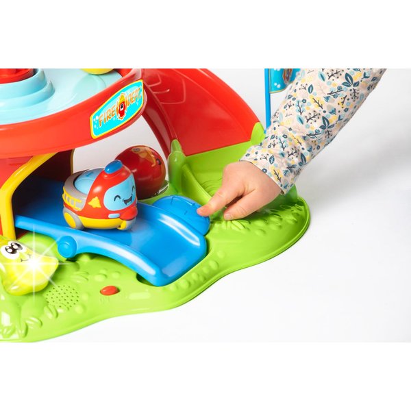 To małe centrum aktywności zawiera w sobie małe pojazdy i piłeczki, które szybko wciągną Twoje dziecko do rozwijającej zabawy. Zabawne dźwięki, światełka i muzyka - niech maluszek sam odkryje, jak to wszystko aktywować! W zestawie oprócz wozu strażackiego i 2 małych strażaków znajdziemy jeszcze 2 zjeżdżalnie i elektronicznego bączka, który zacznie się obracać po naciśnięciu gaśnicy. Maluch może ćwiczyć logiczne myślenie, spostrzegawczość i zdolności manualne.