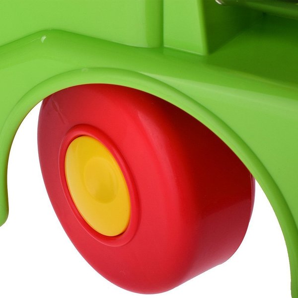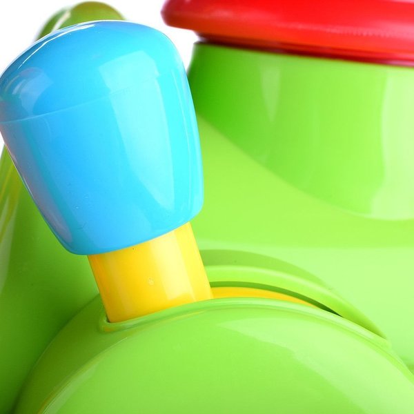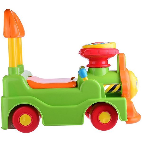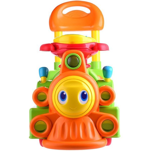 Jeździk jest stabilny - dzięki czterem kółeczkom nie będzie odjeżdżał malcowi, a wygodna tylna rączka pomoże mu bezpiecznie wstać i stawiać pierwsze kroki. W zależności od potrzeb zabawka może spełniać dwie funkcje - może służyć maluchowi jako wygodny pchacz pomocny przy nauce chodzenia bądź też będzie jeździkiem do odpychania się nóżkami, który pozwoli na pierwsze doświadczenia samodzielnego prowadzenia pojazdu.Na kominie Lokomotywy umieszczona jest odczepiana kierownica z przyciskami, którymi włączymy liczne efekty dźwiękowo-świetlne.