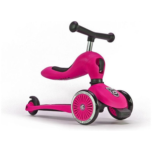 Scoot & Ride Highwaykick to innowacyjne - pojazd 2w1 - jeździk i hulajnoga. Za pomocą jednego guzika zmienia się z wygodnego, bezpiecznego jeździka w łatwą w obsłudze hulajnogę na 3 kółkach. Wyposażona została w system safety-pad - tj. specjalną szeroką podkładkę, umieszczoną w dole przedniej części, która zapobiega m.in. przewróceniu się na nierównym terenie.