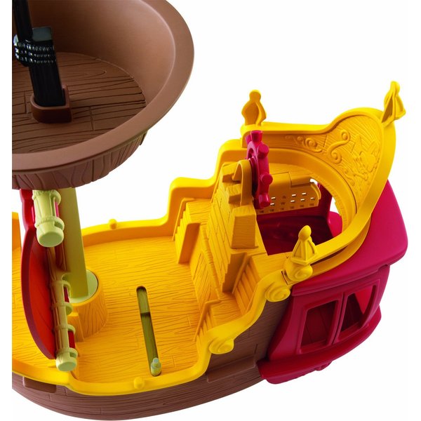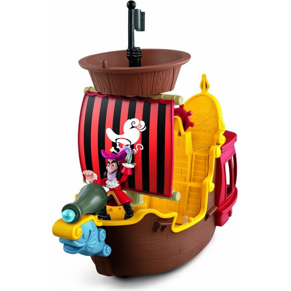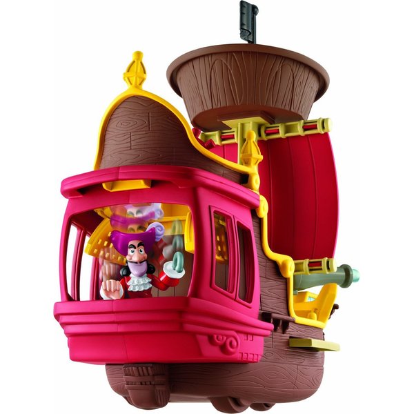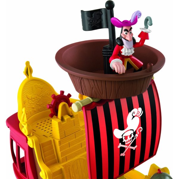Statek piratów wygląda jak prawdziwy i wydaje się bujać na wzburzonych falach, kiedy porusza się na swoich kołach! Gdy dzieci przyczepią kapitana Haka na środkowym pokładzie i przesuną do przodu, z okrętu wysunie się drewniana belka, po której mogą wejść na pokład wrogowie Haka!