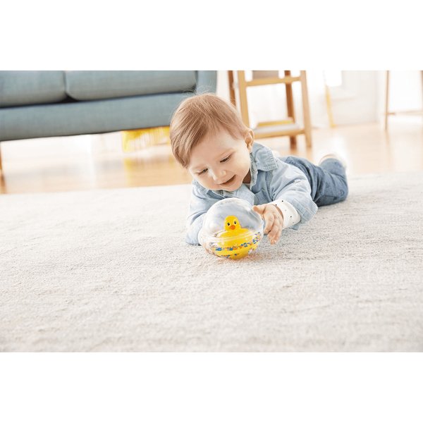 Kultowa zabawka od Fisher Price teraz z kaczuszkami w różnych kolorach! W przezroczystej kuli wypełnionej płynem i kolorowymi perełkami znajduje się urocza kaczuszka. Gdy kula toczy się po podłodze ona sunie wesoło! Świetna zabawa również w kąpieli! Nieważne, jak długo malec będzie próbował zatopić, obrócić czy zanurzyć w wodzie, śliczna kaczuszka i tak wróci na powierzchnię.