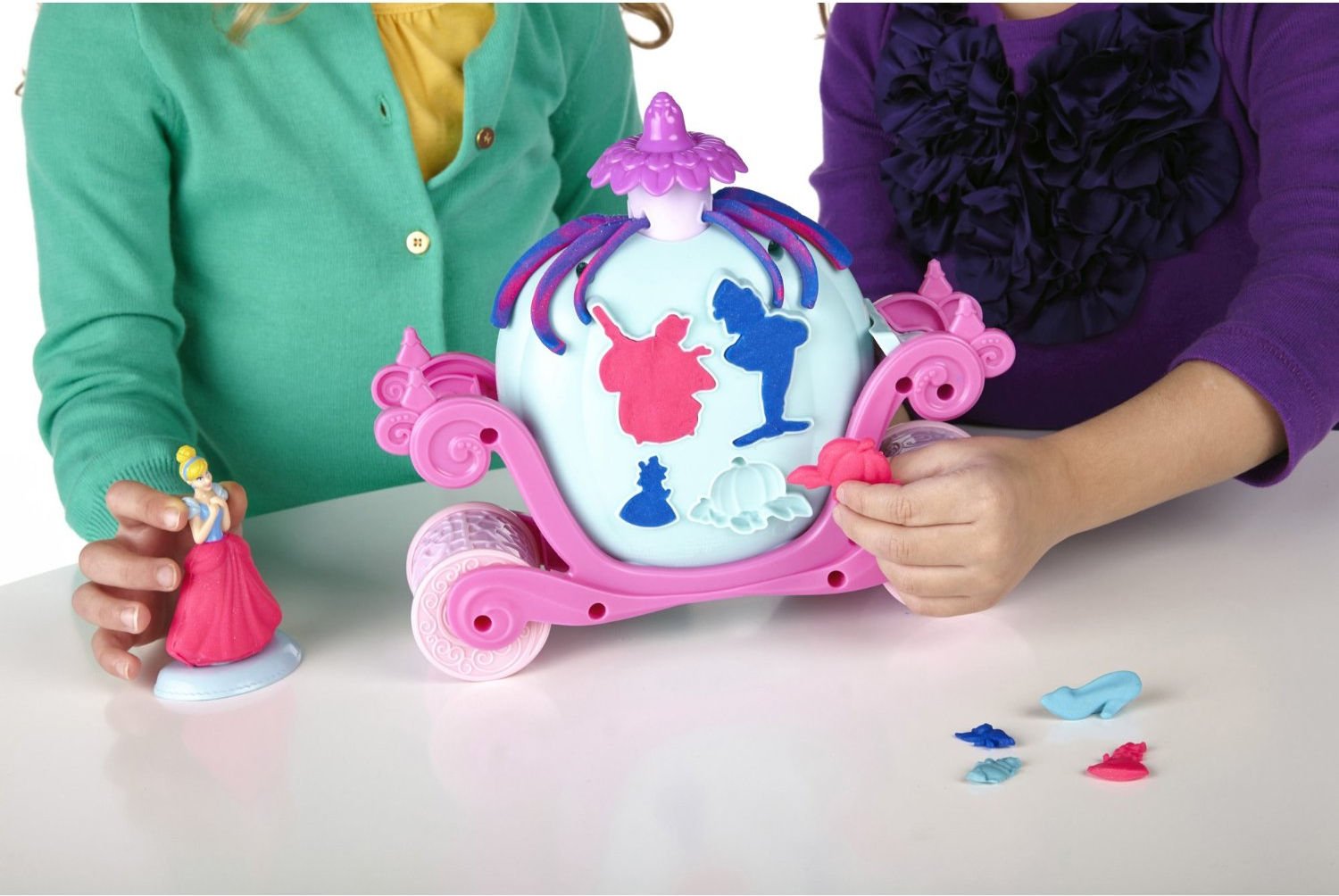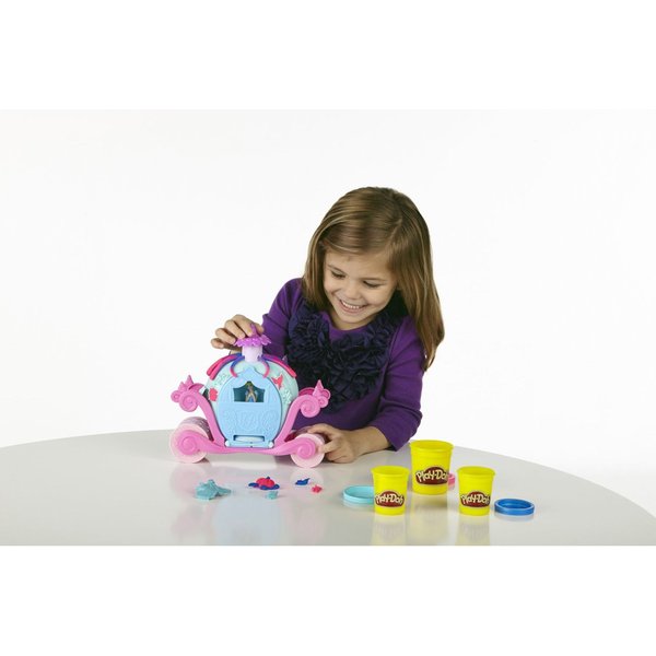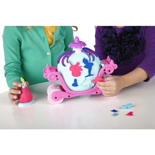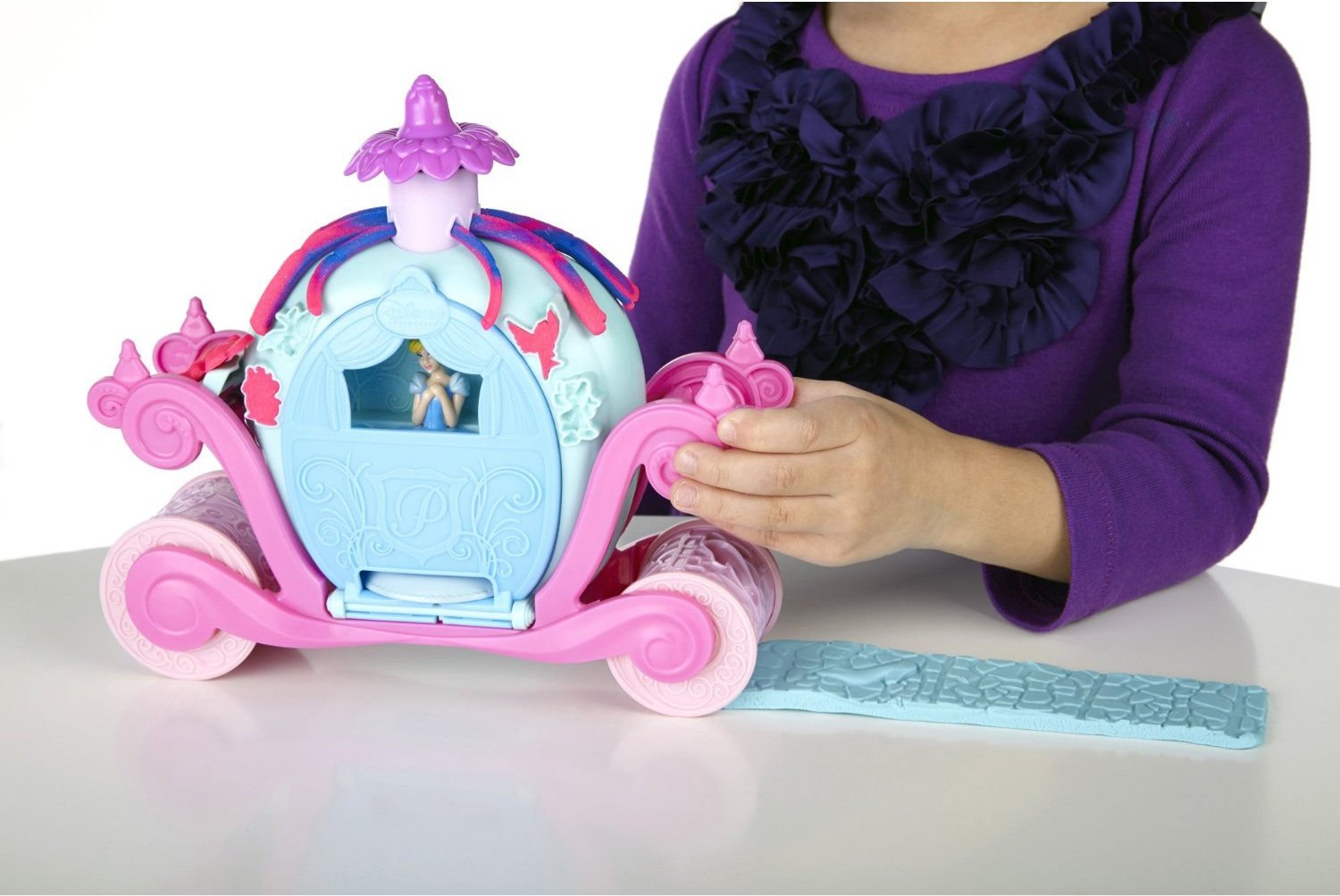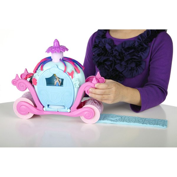 Zmień stare ubrania Kopciuszka w piękną suknię balową z nowym zestawem Karoca Kopciuszka! Gdy Karoca toczy się, tworzy niezwykły ślad szklanego pantofelka Kopciuszka! W zestawie specjalne formy, które m.in. zmieniają myszkę w lokaja! Naciśnij przepiękne winorośle na dachu karocy i zobacz, co się stanie!