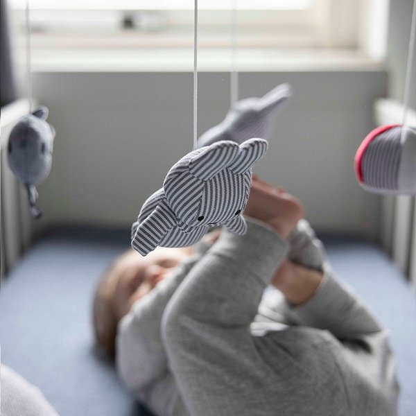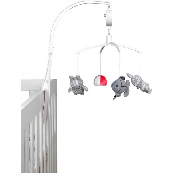 Wykonana w pastelowych kolorach z jednym czerwonym elementem karuzela przyciągnie wzrok i zaangażuje także pozostałe zmysły Twojej pociechy. Pluszowe zawieszki o różnorodnych strukturach możesz zdjąć i dać do zabawy swojemu dziecku. Jest też bezpieczne lusterko i piszczałka. Karuzela obraca się i odtwarza spokojną kołysankę (wymaga nakręcania).