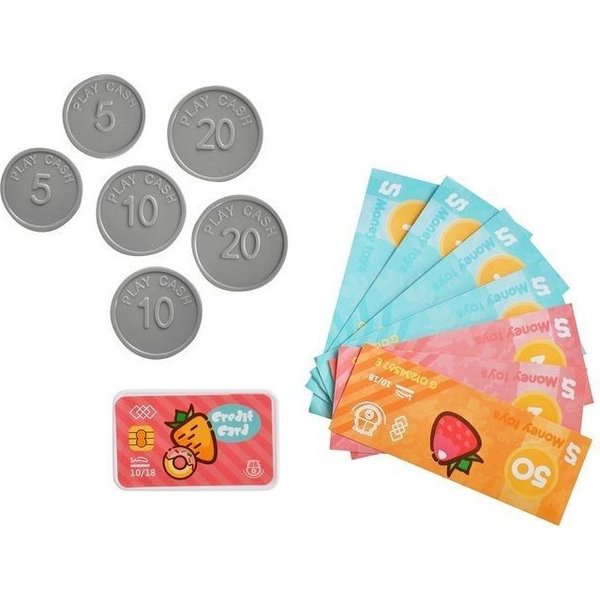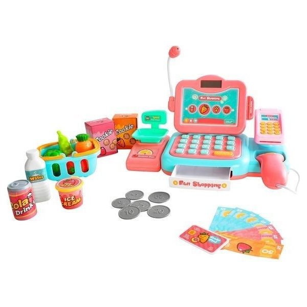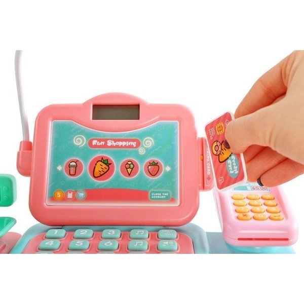 Kasa fiskalna dla dzieci, która jest niezbędnym wyposażeniem każdego, dziecięcego sklepu. Dodatkowe akcesoria dołączone do zestawu pozwolą na stworzenie małego, klimatycznego sklepiku. Jak na profesjonalną kasę przystało posiada ona skaner. Wystarczy zbliżyć go do wypukłej części produktu i nacisnąć guzik. Mikrofon przyda się do wydawania komunikatów dla klientów. To pozwoli stworzyć klimat niczym z supermarketu. Wysuwana szufladka pozwoli przechowywać banknoty. Nie mogło zabraknąć efektów dźwiękowych, które dodają większych wrażeń podczas całej zabawy. W zestawie znajdują się takie elementy jak koszyk czy artykuły spożywcze takie jak: papryka, pomidor, groszek, marchewka, ciasteczka, napój, lody oraz woda. Maluch będzie miał możliwość poczuć się jak dorosły i zapłacić kartą.