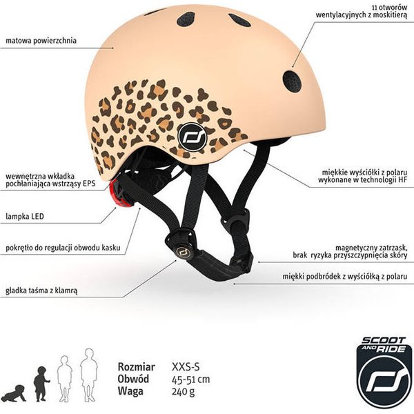 Kask ten może być stosowany przez pierwsze pięć lat życia maluszka, dzięki wygodnej regulacji za pomocą pokrętła. Dużym udogodnieniem jest tu obecność 11 otworów wentylacyjnych obszytych moskitierą, aby żaden owad nie zaplątał się we włosy dziecka. Zapewniają one odpowiedni przepływ powietrza, nie dopuszczając do nadmiernego pocenia się główki. W tyle kasku znajduje się jeszcze ledowa lampka z 3 trybami świecenia, którą warto włączyć, kiedy zrobi się ciemno.