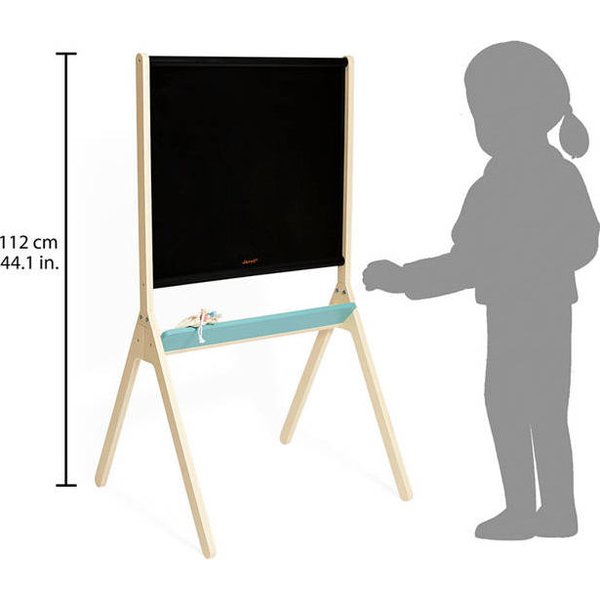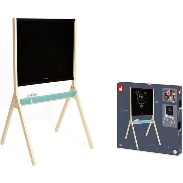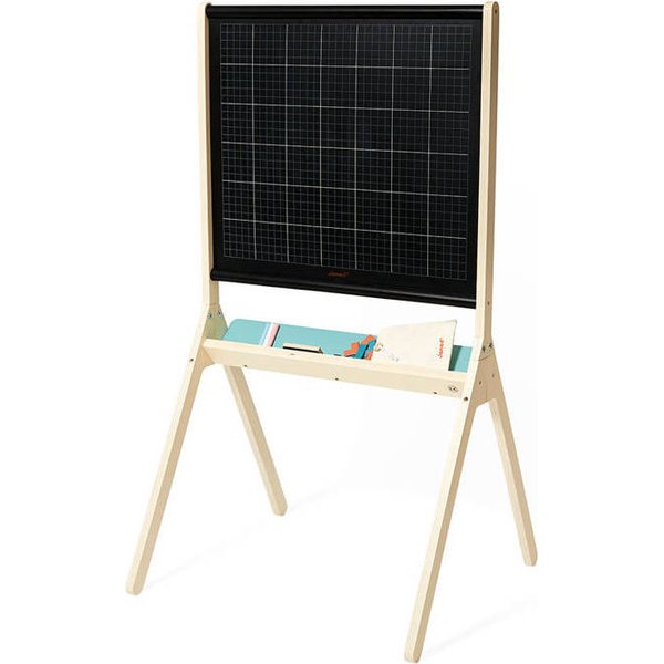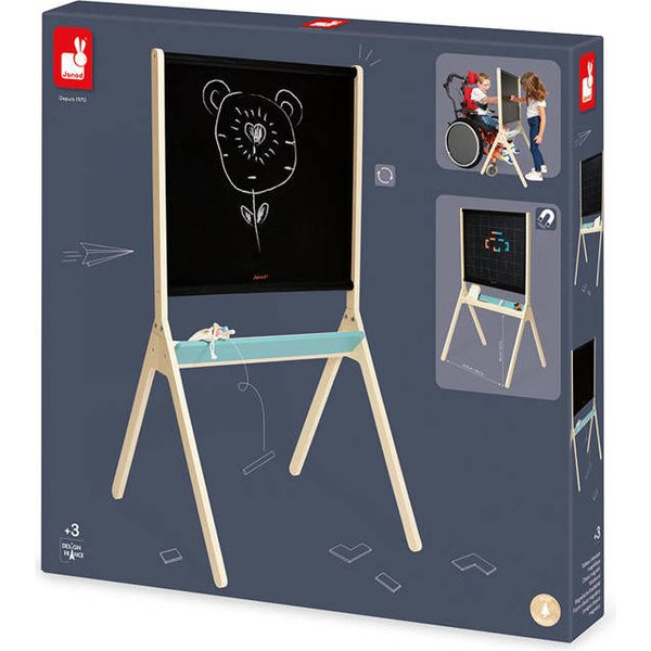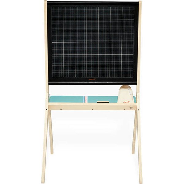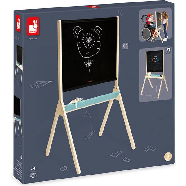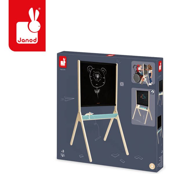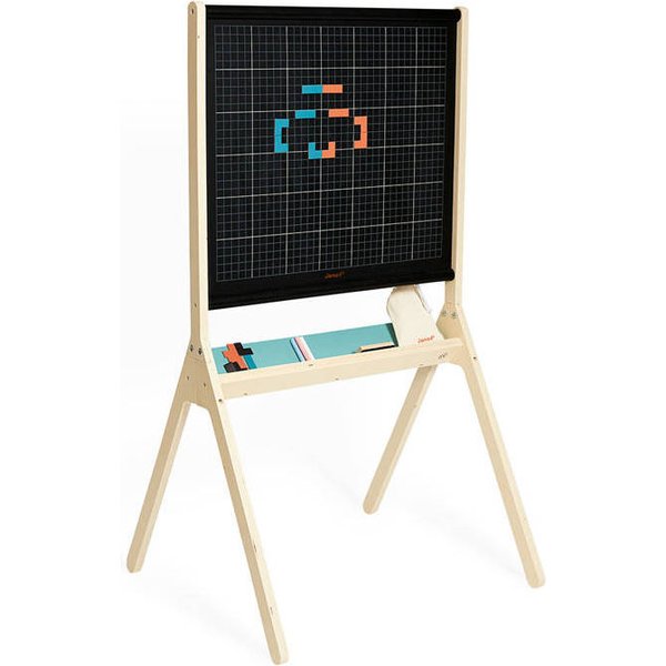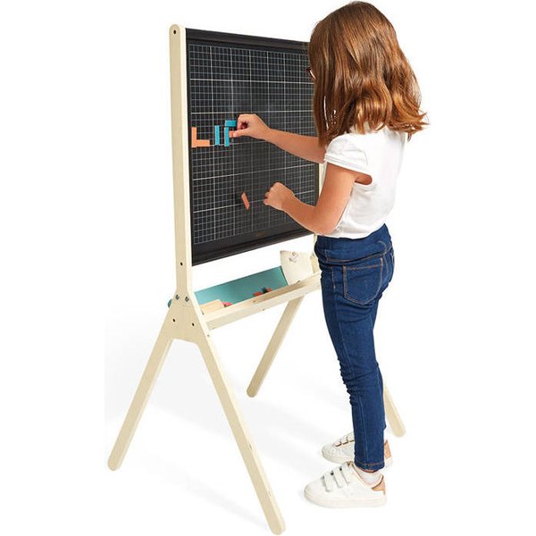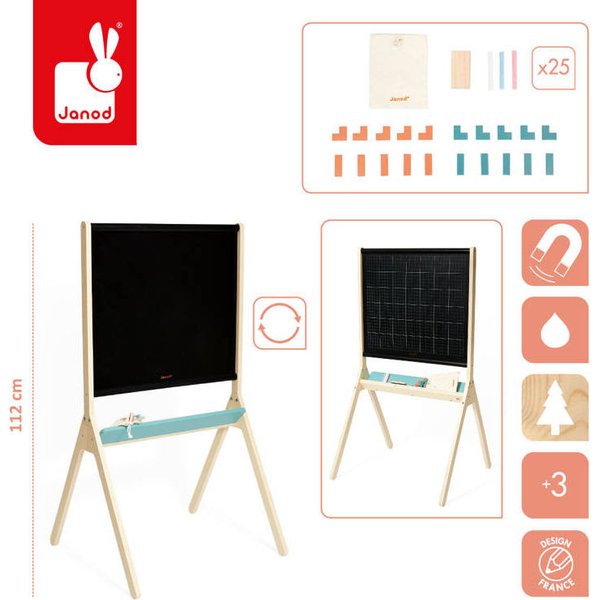 Prezentujemy klasyczną, drewnianą tablicę magnetyczną 3+ marki Janod, idealną dla małych artystów i uczniów. Ta elegancka, dwustronna tablica (czarna po jednej stronie, z białą siatką geometryczną po drugiej) posiada stabilne nogi i jest przystosowana dla dzieci poruszających się na wózku inwalidzkim. Obie strony tablicy są magnetyczne, a zestaw zawiera 3 kredy (białą, niebieską i różową) i 20 geometrycznych magnesów pikselowych. Zabawka nie tylko rozwija wyobraźnię i zdolności manualne dziecka, ale także pomaga w nauce pisania, liczenia i geometrii. W zestawie znajduje się broszura z propozycjami zabaw oraz oryginalna półeczka w kształcie litery „V” na wszystkie akcesoria i drobiazgi. Tablica Janod to doskonały pomysł na prezent dla każdego małego artysty i ucznia.