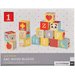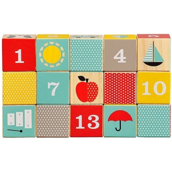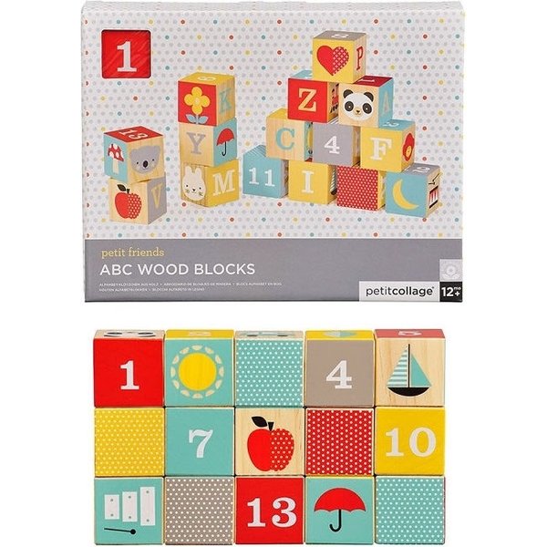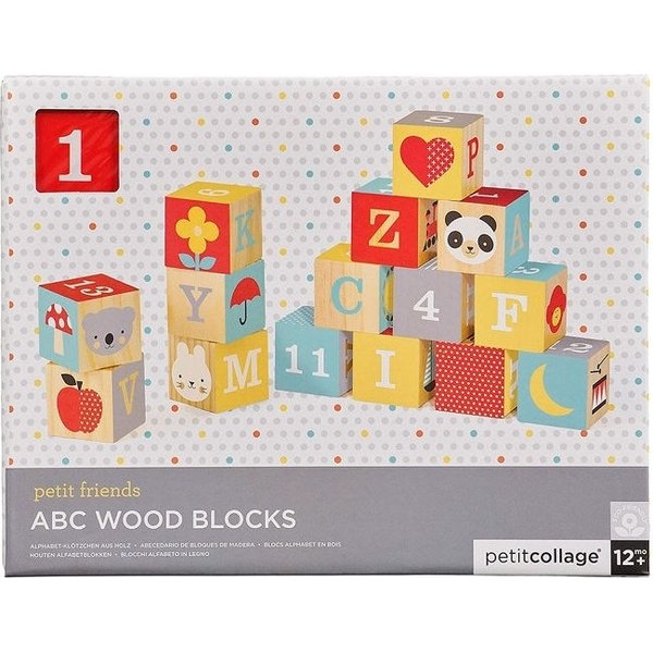 Klocki drewniane firmy Petit Collage są ciekawą formą na naukę alfabetu, liczb i zwierząt dla dzieci. Zestaw zawiera 15 sześcianów, na których są kolorowe ilustracje literek, cyferek, ciekawe obrazki oraz zwierzątka. Klocki nadają się do układania wieży oraz różnych wymyślonych przez dziecko budowli.