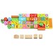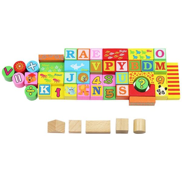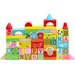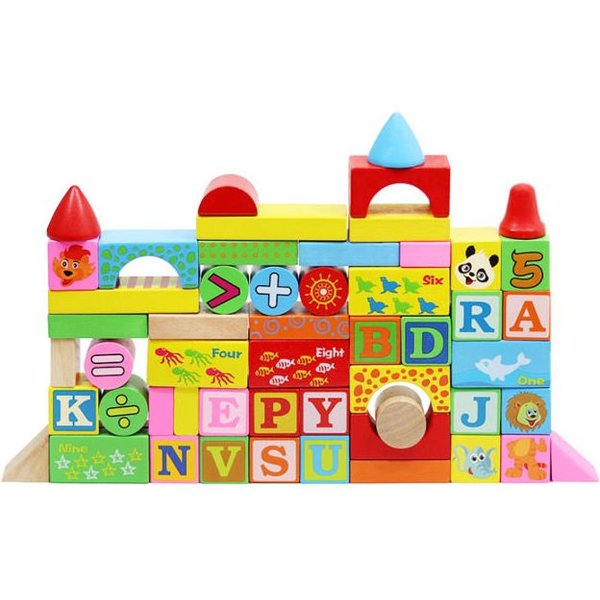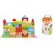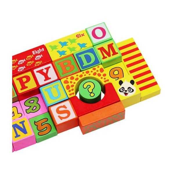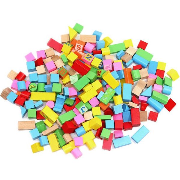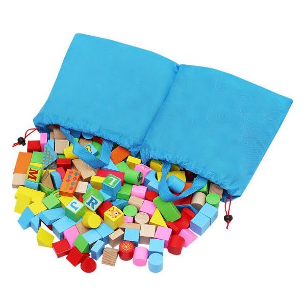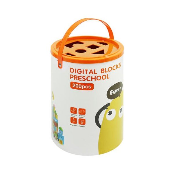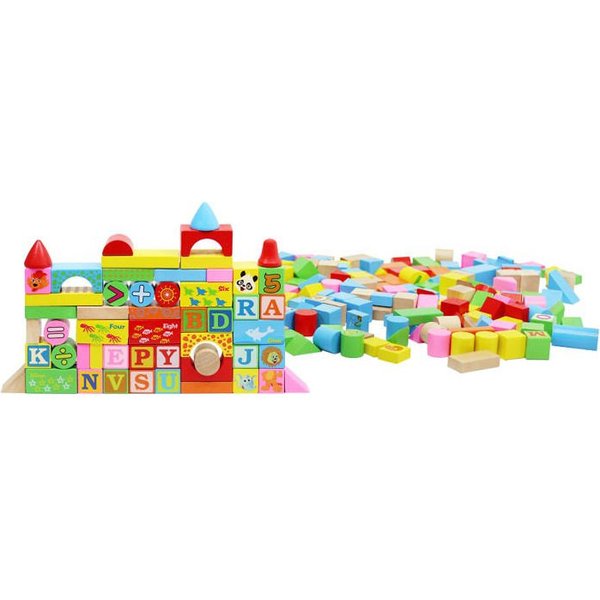 Zestaw drewnianych klocków to aż 200 sztuk, które zapewniają wspaniałą zabawę. Wszystkie przechowamy w specjalnym wiaderku, tak aby po skończonej zabawie zapanował porządek, a cały komplet można było w łatwy sposób przetransportować. Dodatkowo pokrywka wyposażona została w otwory, co spełnia funkcje sortera. To pozwala na przyswojenie przez maluszki kształtów i ich dopasowania do odpowiednich otworów. Na klockach znajdują się literki oraz angielskie słówka. To pozwala przyswoić alfabet i pierwsze słówka obcego języka. Wykonane są z drewna i pomalowane nietoksycznymi farbkami. Brak ostrych krawędzi zwiększa bezpieczeństwo podczas zabawy.