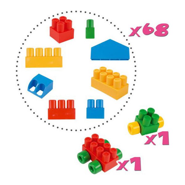 Zestaw 70 klocków w atrakcyjnej kolorystyce wykonanych z wysokiej jakości tworzywa sztucznego.