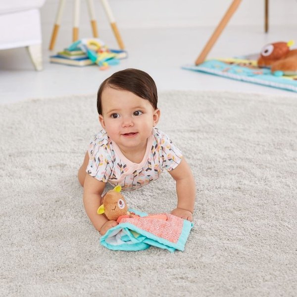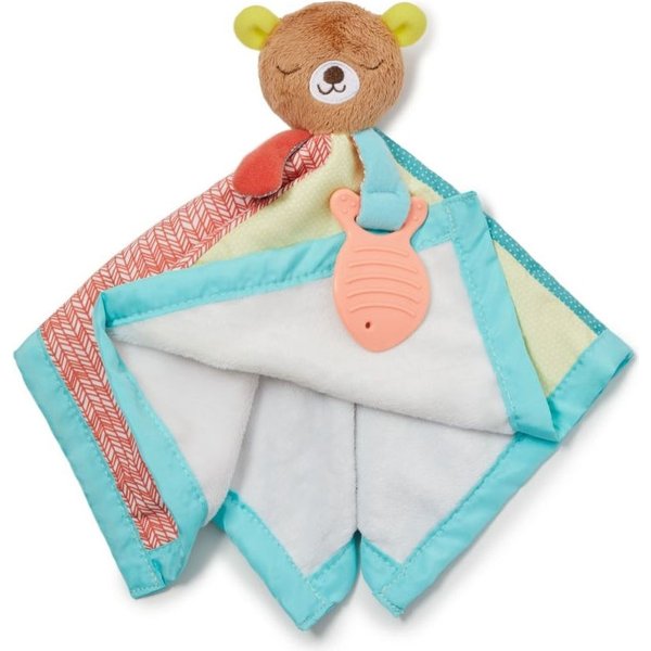 Kocyk przytulanka przyda się każdemu dziecku podczas zabawy w domu, ale również na spacerze. Wykonany z przyjemnego materiału będzie przyjazny dla delikatnej skóry dziecka. Wyraziste kolory pobudzają zmysł wzroku dziecka. Dodatkową atrakcje daje miś - piszczałka trzymający gryzaczek w łapce - gwarantuje on pełnię zabawy.
