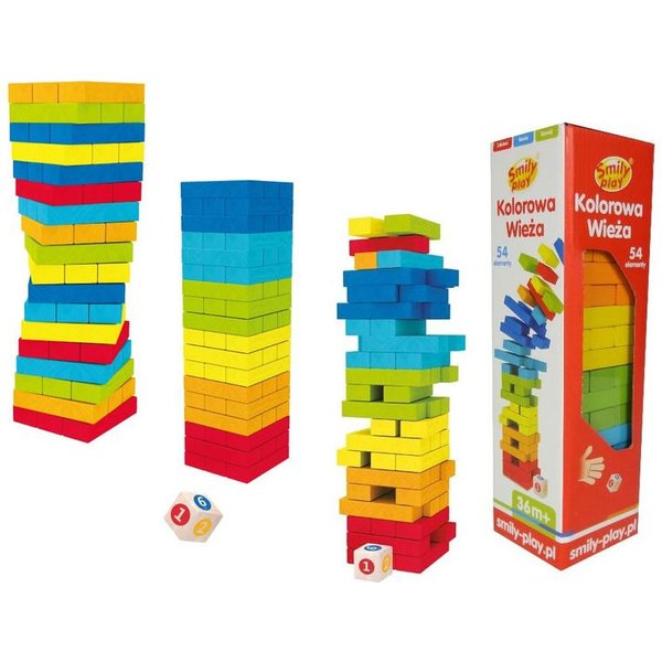 Kolorowa wieża od Smily Play to gra, która wykonana jest z wysokiej jakości drewna. Nie posiada ostrych krawędzi i pomalowana została farbami, które nie są szkodliwe dla zdrowia.