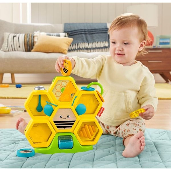 Teraz maluszki mogą być pracowite jak pszczółki! Uroczy zestaw od Fisher Price, który pozwoli wejść w świat i życie jakie toczy się w ulu. Dziecko do dyspozycji będzie miało kolorowe krążki, które należy włożyć je do środka. To pozwoli im trenować zdolności manualne, a jednocześnie poznać zależności przyczynowo-skutkowe. Po umieszczeniu żetonu w ulu, maluch zaobserwuje jak przemieszczają się one po ulu. Jednak nie zawsze będą poruszać się tak samo! Na swojej drodze mogą napotkać metalowy dzwoneczek! Dodatkowo zestaw wyposażony został w takie elementy jak: obrotowy wałeczek, klapka, klekotka, które również wpłyną pozytywnie na rozwój maluszka. Zabawka posiada również schowek na krążki, co pozwoli zachować je w jednym miejscu.