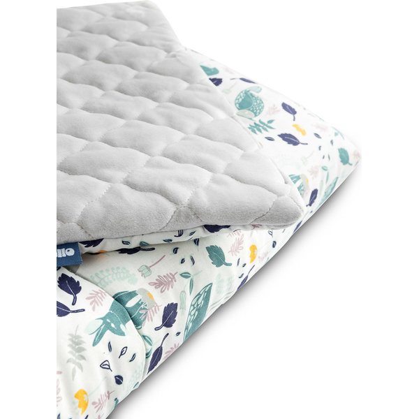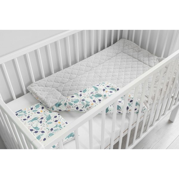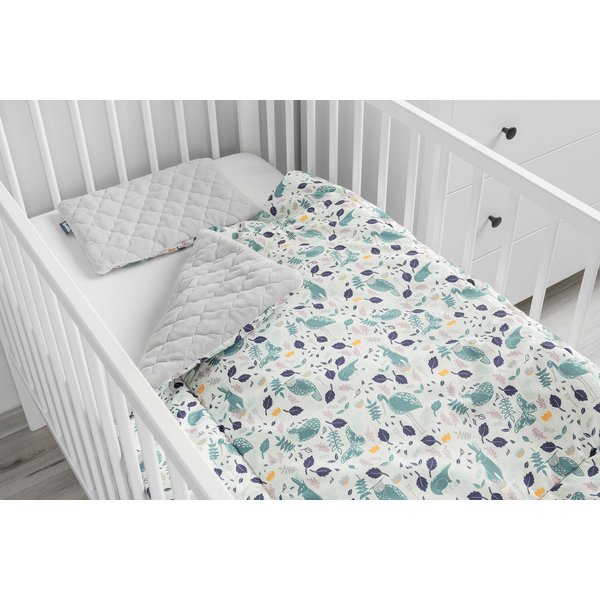 Komplet do łóżeczka to niezwykle przyjemny w dotyku kocyk i poduszka, które będą świetnym dodatkiem do wózka lub łóżeczka, przy okazji zapewniając komfortowy sen czy spacer. Wykonany został z bawełny, a w połączeniu z delikatnym pluszem tworzą duet idealny. Wypełnione są one antyalergiczną włókniną silikonową, a uroku dodaje im pikowany wzór chmurek, który wyróżnia je od tradycyjnego materiały Minky.