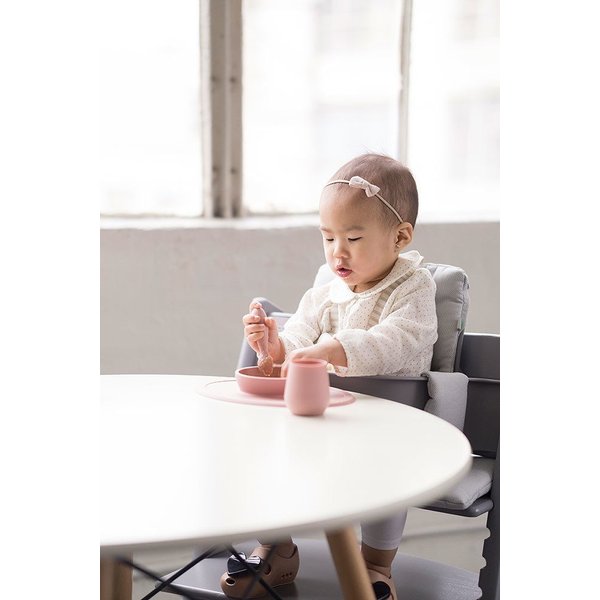 Komplet silikonowych naczyń, poza nowoczesnym, ładnym designem i ciekawymi kolorami oferuje również wygodę użytkowania. Wszystkie elementy zestawu posiadają zaokrąglony, ergonomiczny kształt i gładkie brzegi, które ułatwiają rodzicowi i dziecku trzymanie naczynia. Dodatkowym atutem jest duża podkładka razem z miską, która zabezpieczy stół przed bałaganem w trakcie posiłku.