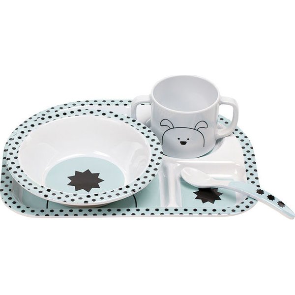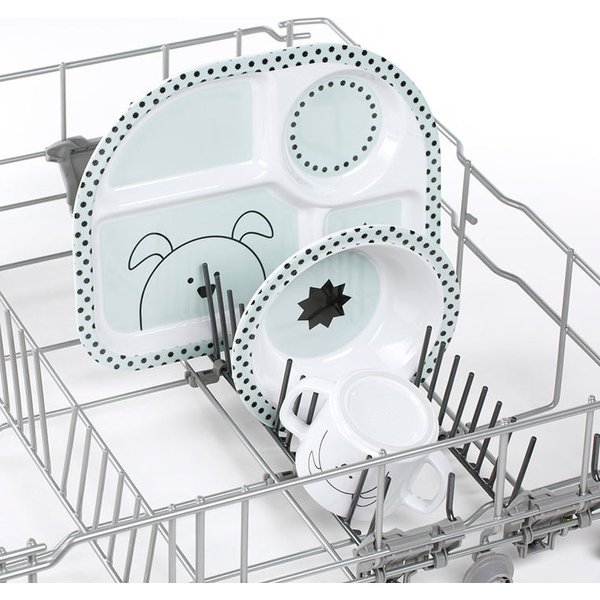 Designerski zestaw naczyń, w którym znajdziemy talerzyk, miseczkę, łyżeczkę i kubek są praktyczne i ułatwią podanie posiłku naszemu szkrabowi. Dzięki trzem komorom możemy podzielić obiadek, a maluszkowi będzie łatwiej poznawać nowe smaki.