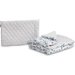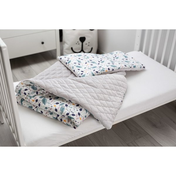 Komplet do łóżeczka to niezwykle przyjemny w dotyku kołderka i poduszka, które będą świetnym dodatkiem do wózka lub łóżeczka, przy okazji zapewniając komfortowy sen czy spacer. Wykonany został z bawełny, a w połączeniu z delikatnym pluszem tworzą duet idealny. Wypełnione są one antyalergiczną włókniną silikonową, a uroku dodaje im pikowany wzór chmurek, który wyróżnia je od tradycyjnego materiały Minky.