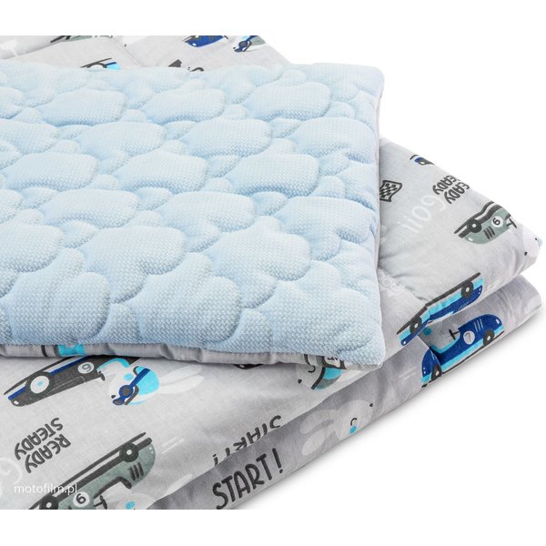 Komplet Velvet to niezwykle przyjemny w dotyku kocyk i poduszka, które będą świetnym dodatkiem do wózka lub łóżeczka, przy okazji zapewniając komfortowy sen czy spacer. Wypełnione są one antyalergiczną włókniną silikonową, a uroku dodaje im pikowany wzór chmurek, który wyróżnia je od tradycyjnego materiały Minky. Oprócz tego kocyk posiada kolorowe tasiemki, które z pewnością zaciekawią dziecko, a przy okazji będzie mogło ćwiczyć chwytanie.