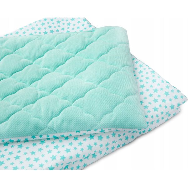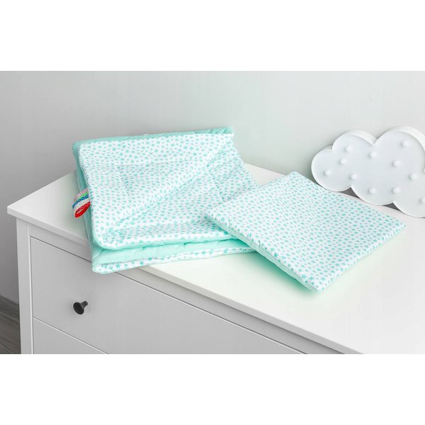 Komplet Velvet to niezwykle przyjemny w dotyku kocyk i poduszka, które będą świetnym dodatkiem do wózka lub łóżeczka, przy okazji zapewniając komfortowy sen czy spacer. Wypełnione są one antyalergiczną włókniną silikonową, a uroku dodaje im pikowany wzór chmurek, który wyróżnia je od tradycyjnego materiały Minky. Oprócz tego kocyk posiada kolorowe tasiemki, które z pewnością zaciekawią dziecko, a przy okazji będzie mogło ćwiczyć chwytanie.