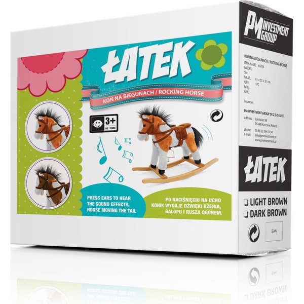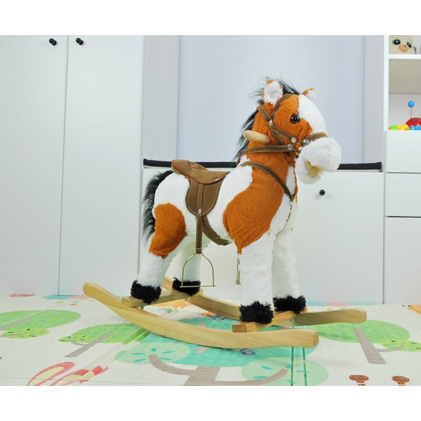 Uroczy wygląd, przyjemna w dotyku sierść oraz ciekawe opcje zachwycą każdego maluszka. Ten konik oprócz tradycyjnej funkcji bujania oferuje także inne atrakcje: rusza ogonem i pyskiem, wydając przy tym typowo końskie odgłosy! Strzemiona, siodło i drewniane uchwyty pozwolą Twojemu dziecku poczuć się bezpiecznie i pewnie na tym małym wierzchowcu.
