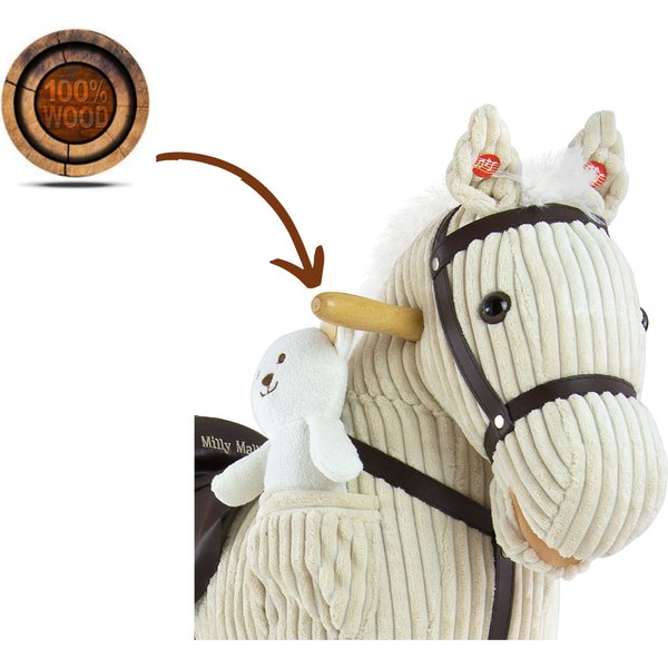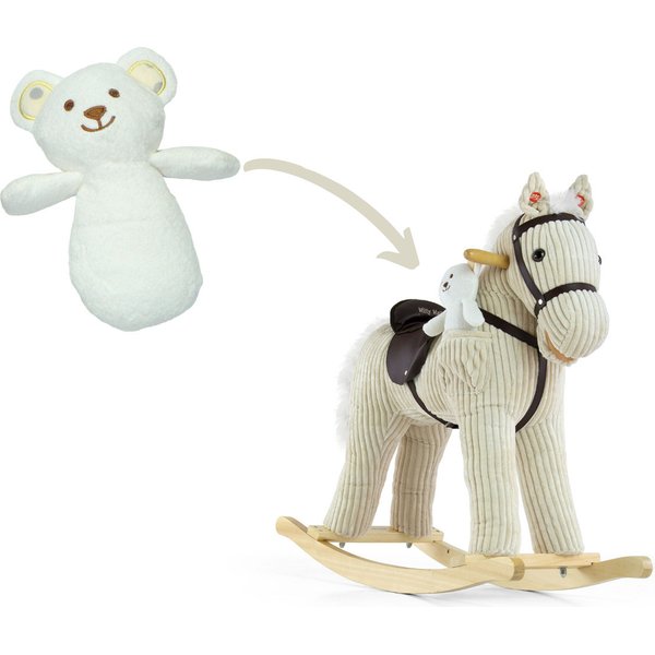 Urocza kolorystyka i przyjemny w dotyku, pluszowy materiał w połączeniu z drewnem i zadziwiającymi funkcjami robią duże wrażenie! Konik posiada wyprofilowane, wygodne siedzisko, dzięki czemu Twoje dziecko może liczyć na bezpieczną i komfortową zabawę. Autentyczności dodaje fakt, że pony potrafi ruszać pyskiem i ogonem, a oprócz tego wydaje odgłosy. Posiada drewniane bujaki i uchwyty. Do konika dołączono małego misia, który stanie się ulubioną przytulanką i towarzyszem wypraw.