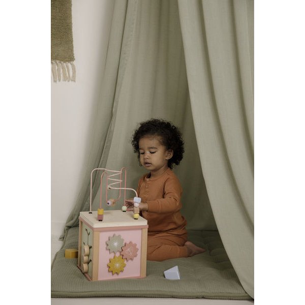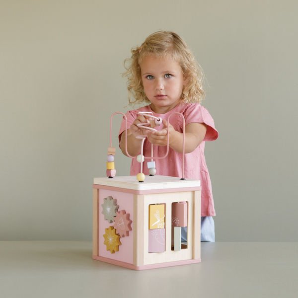 Kostka edukacyjna Wild Flowers FSC od Little Dutch to doskonała zabawka dla dzieci, która rozwija umiejętności wzrokowo-poznawcze, ćwiczy motorykę i wyobraźnię. Drewniana kostka w kolorze różowym z kolekcji Wild Flowers oferuje wiele zajęć edukacyjnych, w tym sortownik kształtów, przekładnie obrotowe, układanki i zabawną spiralę z koralików na górze. Zabawka wykonana jest z wysokiej jakości drewna z certyfikatem FSC, malowana bezpiecznymi farbami na bazie wody. To doskonały pomysł na prezent.