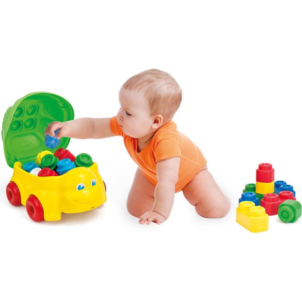 Uśmiechnięty żółwik kryje pod swoją skorupą kolorowe klocki, wyrzuć je ze środka i układaj przeróżne budowle. Pancerz posłuży także jako podest do układania. Po skończonej zabawie włóż klocki z powrotem do środka i wybierz się na przejażdżkę - żółwik posiada ruchome kółka!