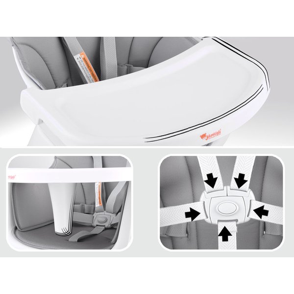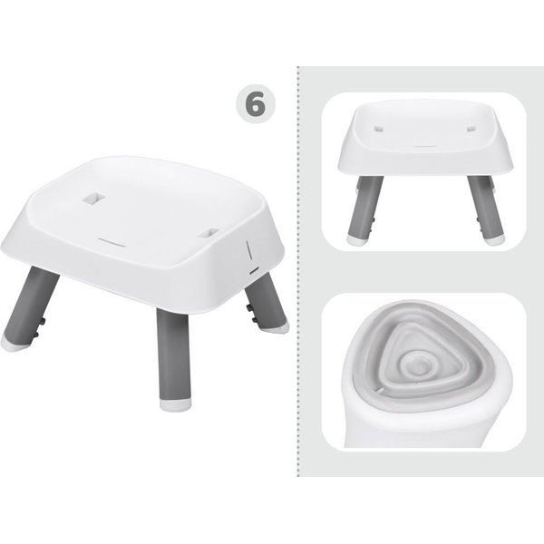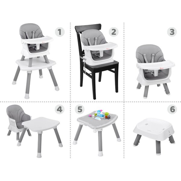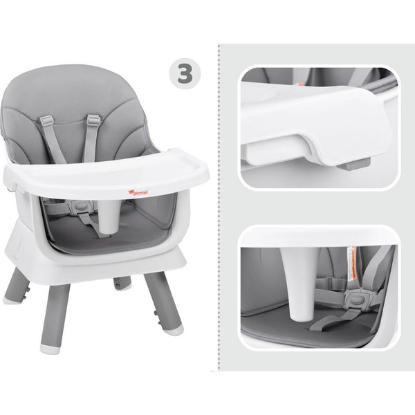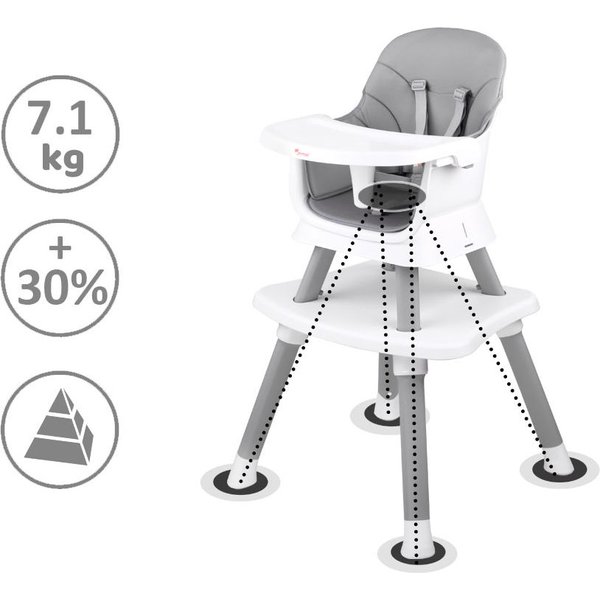 Krzesełko do karmienia 6w1 Jokomisiada to doskonałe rozwiązanie dla każdego rodzica. To funkcjonalny mebel, który rośnie razem z dzieckiem i można go wykorzystać na wiele sposobów. Dzięki możliwości użytkowania w różnych opcjach, krzesełko pasuje do stołu w jadalni, a także do kącika zabaw dziecięcych. Fotelik wyposażony jest w pięciopunktowe pasy bezpieczeństwa, blokadę przed zsunięciem się z krzesełka oraz łatwo czyszczącą się tapicerkę. Zestaw zawiera nadstawkę na krzesło do jadalni, niskie krzesełko z tacką do karmienia, krzesełko z stolikiem do zabawy, stolik z blatem do układania klocków oraz niski stołek/taboret. Dzięki maksymalnemu obciążeniu 25 kg i wiekowi od 6-mca, krzesełko 6w1 Jokomisiada będzie długo służyło.